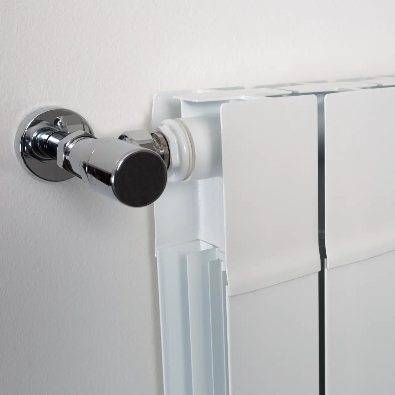 Set cromo valvola termostatizzabile e detentore a squadra con attacco per tubo rame, multistrato o ferro, finitura cromo con manopola in plastica bianca.
